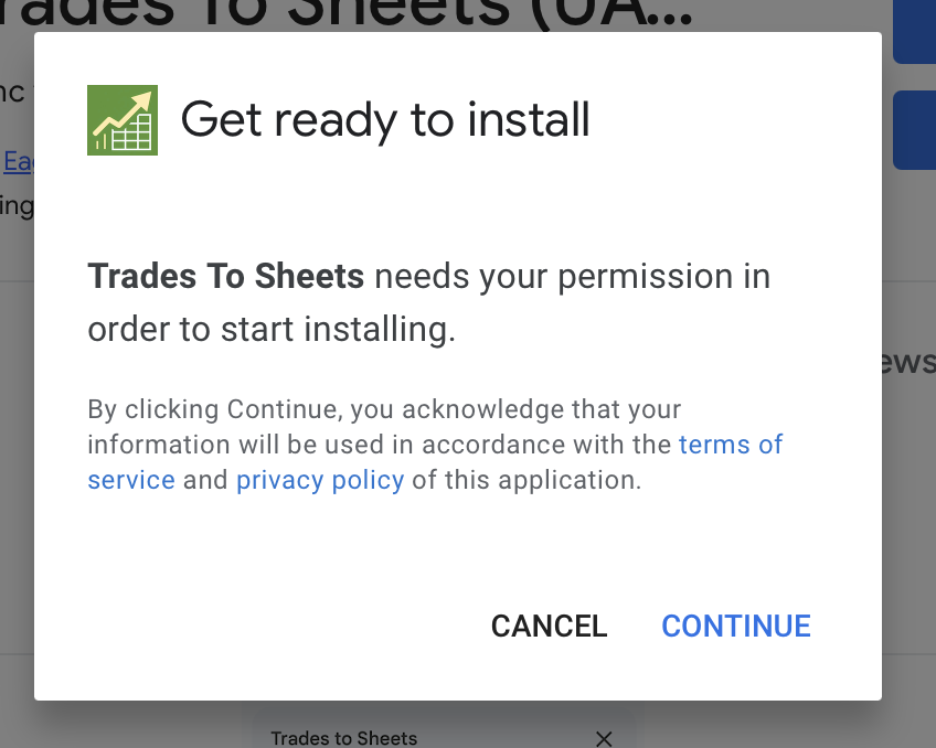 3. Authorize Permissions A Google permission prompt will appear. Review and Accept the required permissions to allow the Add-On to securely interact with your spreadsheet and fetch data from the Trades to Sheets API.