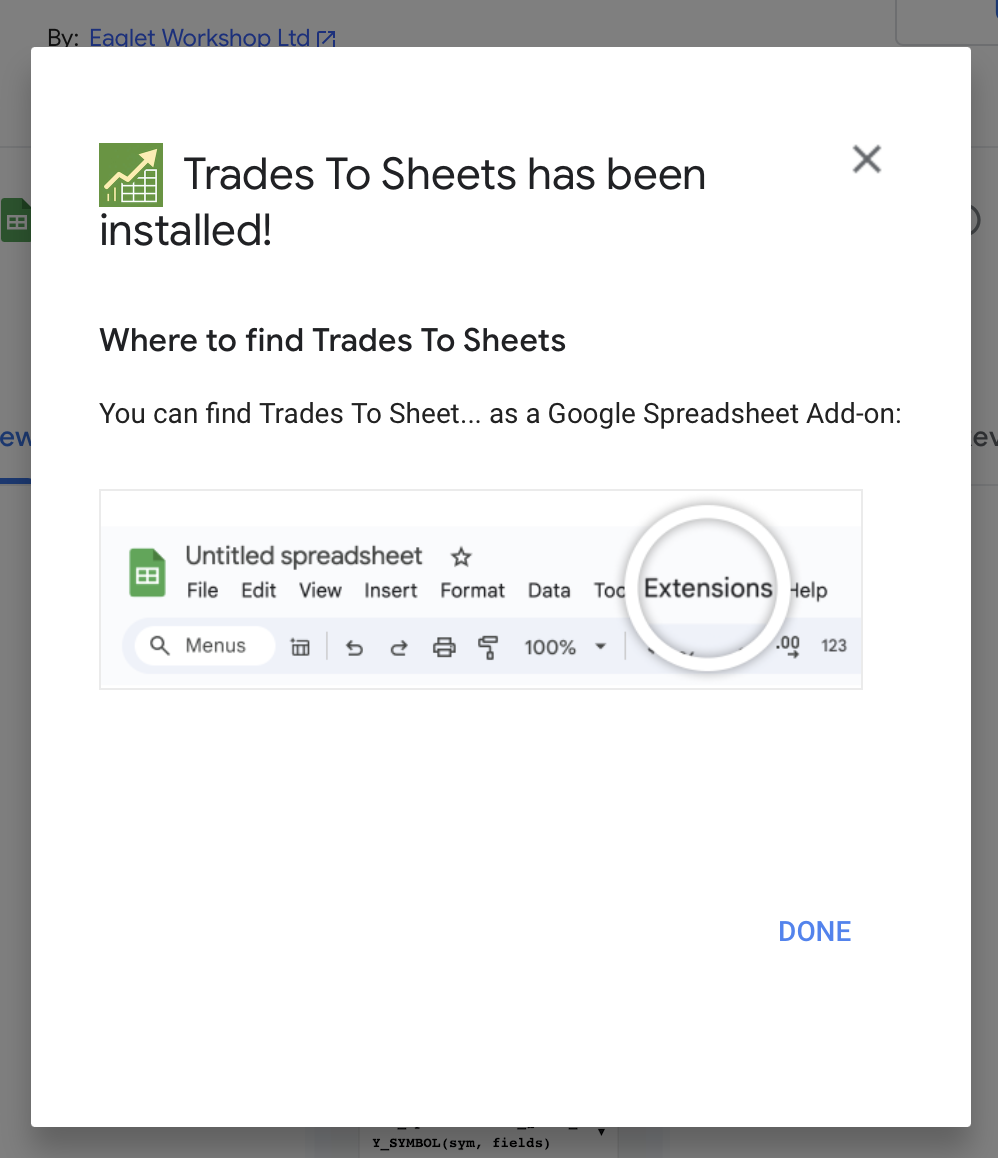 4. Confirm Success Once the process is complete, a notification will appear stating that "Trades to Sheets has been installed." Click "Done."