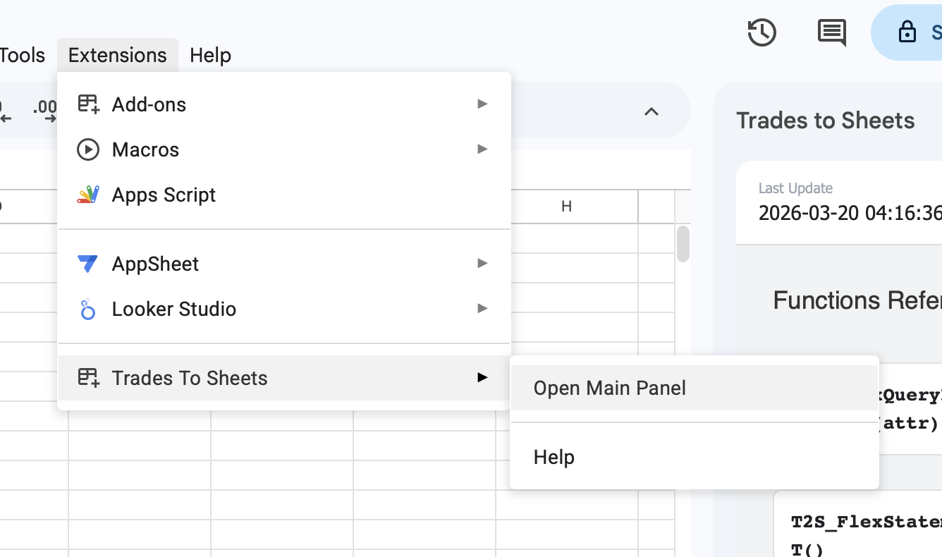 5. Access the Menu Open any Google Sheet. Go to "Extensions", you should now see a "Trades to Sheets" option in your top menu bar.