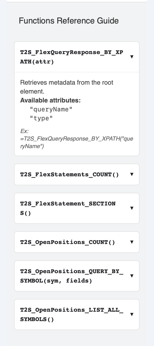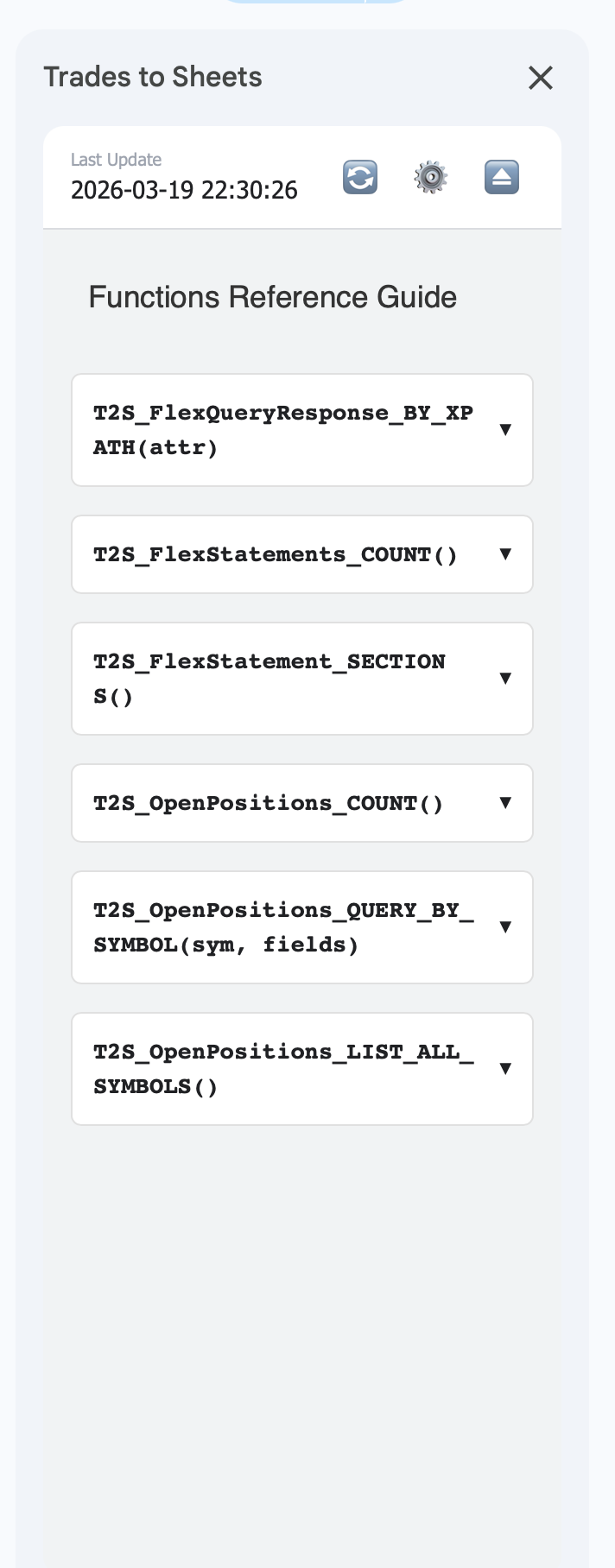 Below the control bar is the Function Reference Guide. This is a handy, built-in reference that shows you all the customized "Trades to Sheets" functions available for your spreadsheets.